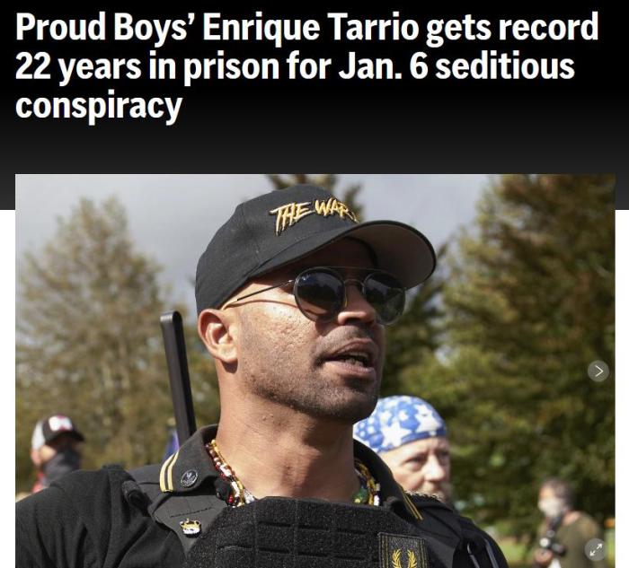據報道,涉嫌幕后策劃2021年1月6日美國國會騷亂的極右翼組織“驕傲男孩”前主席塔里奧(Enrique Tarrio),于當地時間5日在華盛頓特區(qū)聯邦法院被判處22年監(jiān)禁刑期,被控煽動陰謀等罪名。