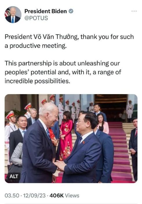 在這條發(fā)布在美國(guó)總統(tǒng)官方賬號(hào)上的帖子里,拜登為“富有成效的會(huì)議”向武文賞(Vo Van Thuong)表示感謝。然而,配發(fā)的圖片中并沒有出現(xiàn)武文賞,而是放了拜登和越南國(guó)會(huì)主席王庭惠(Vuong Dinh Hue)握手的照片。這條帖子目前已被刪除。