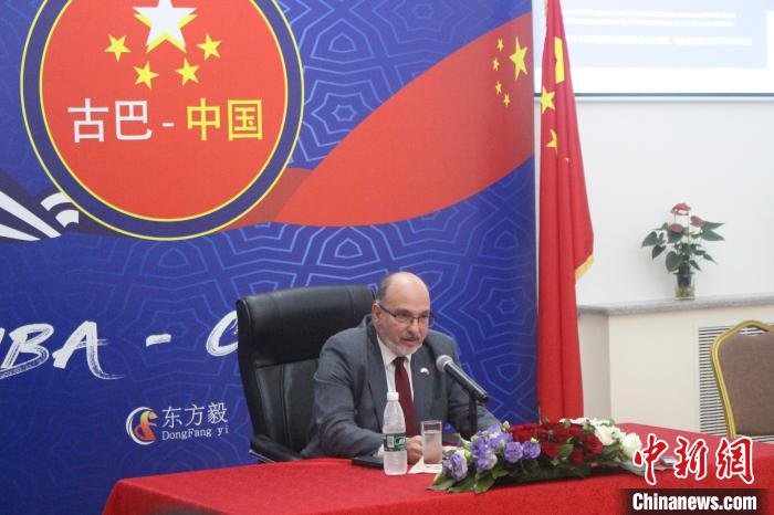 古巴駐華大使白詩德在古巴駐華大使館13日舉行的媒體見面會上發(fā)言。 蘇婧欣 攝