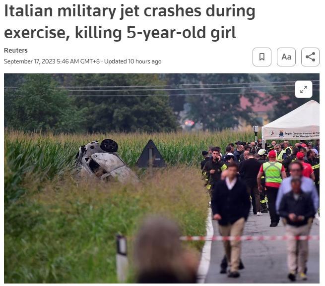 中新網(wǎng)9月17日電 綜合外媒報道,當(dāng)?shù)貢r間16日,意大利空軍“三色箭”飛行表演隊的一架飛機(jī)在都靈郊外訓(xùn)練時墜毀,導(dǎo)致地面一名5歲女童身亡,飛行員在墜毀前彈射逃生。