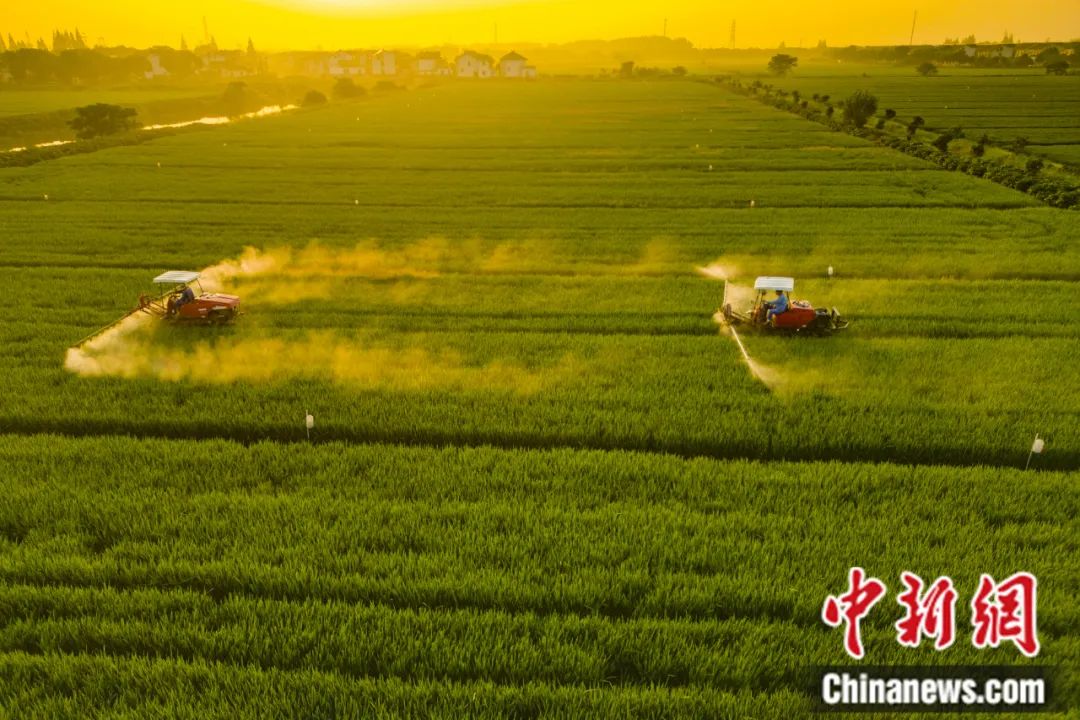 江蘇省昆山市三聯(lián)村雙婁里稻田,農(nóng)民駕駛植保機為水稻噴農(nóng)藥。袁新宇 攝