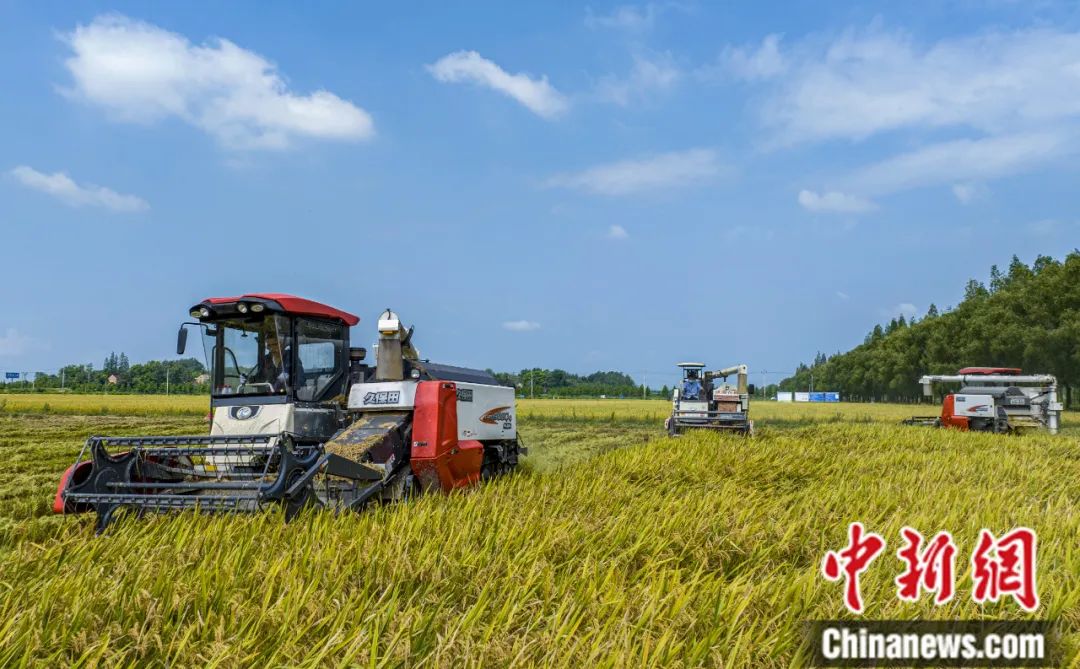 安徽省合肥市廬江縣廣寒村河廣家庭農(nóng)場,農(nóng)機手操作農(nóng)機在大田里收割早稻。左學長 攝