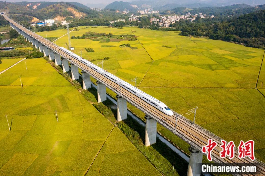 廣西梧州市龍圩區(qū)大坡鎮(zhèn)河步村,一列動車穿行于金色稻田。何華文 攝