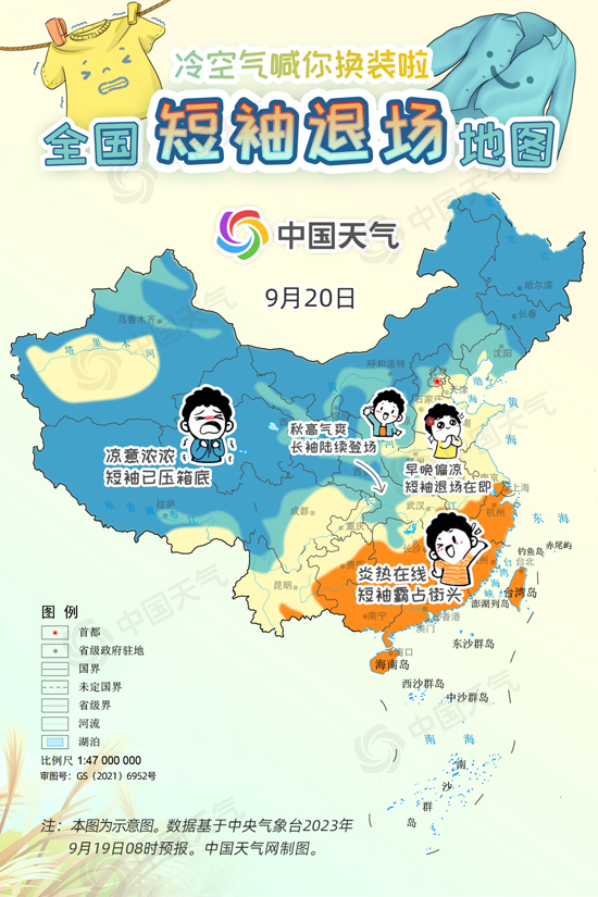 從中國天氣網(wǎng)推出的全國短袖退場地圖可以看出,隨著冷空氣滲透南下,未來三天我國穿短袖的區(qū)域?qū)⒚黠@縮小,河北、陜西、山西、安徽、江蘇、湖北、湖南等地將穿上今年秋天的第一件長袖或外套。