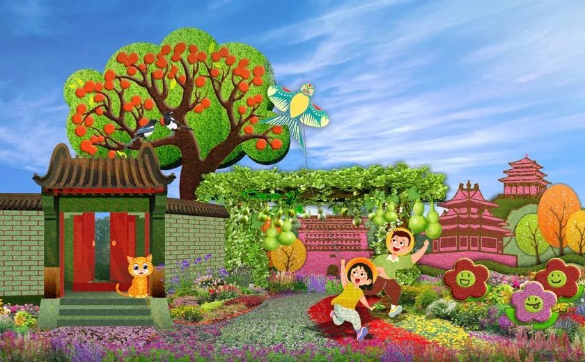 9. 西單西南角的“美好家園”花壇頂高8.5米,以京城胡同群眾的幸福生活為場景,配以放風箏的少年、柿子樹、花架、中軸景觀等生機盎然的景象,書寫了人民幸福生活的新圖景。