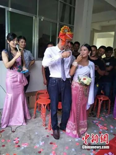 圖為2017年,景邁山傣族姑娘玉擺與法國小伙威廉喜結良緣。鐘欣 攝