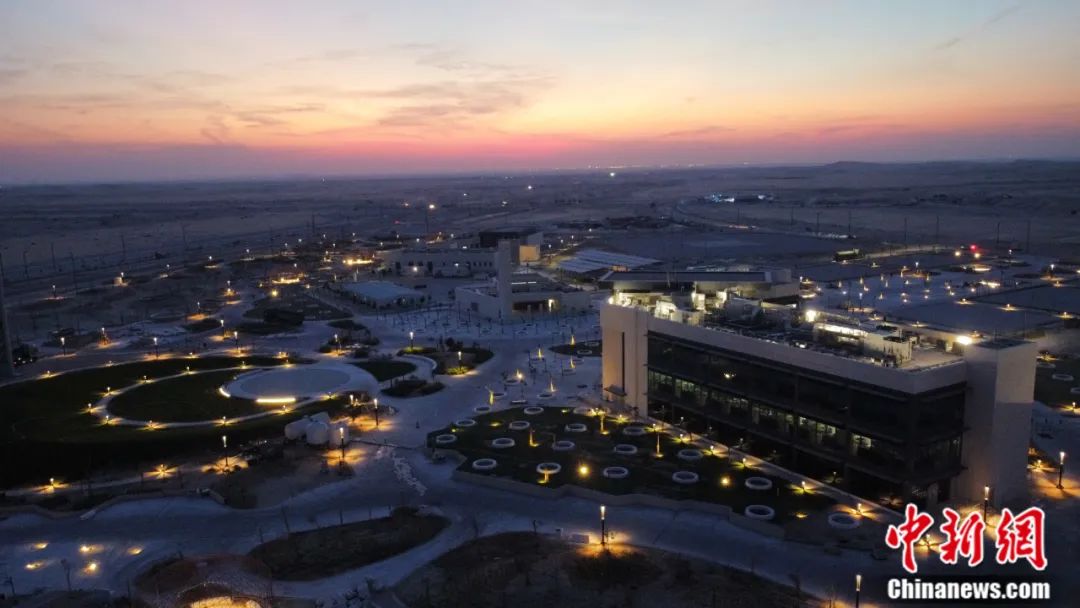 中鐵十八局集團(tuán)承建的沙特薩拉曼國王能源城項(xiàng)目行政樓、禮堂、醫(yī)院等五棟建筑及附屬工程燈光效果。(2022年11月拍攝)杜林 攝
