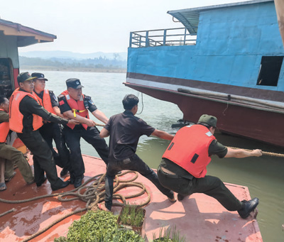 中老執(zhí)法人員在湄公河上對(duì)商船開(kāi)展聯(lián)合檢查。