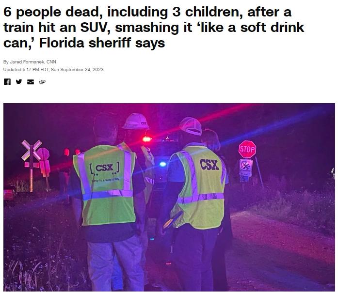 中新網(wǎng)9月25日電 據(jù)美國有線電視新聞網(wǎng)(CNN)24日報道,當?shù)貢r間23日晚,美國佛羅里達州希爾斯伯勒縣一列火車在經(jīng)過鐵路口時與一輛SUV汽車相撞,造成6人遇難,其中包括3名兒童。