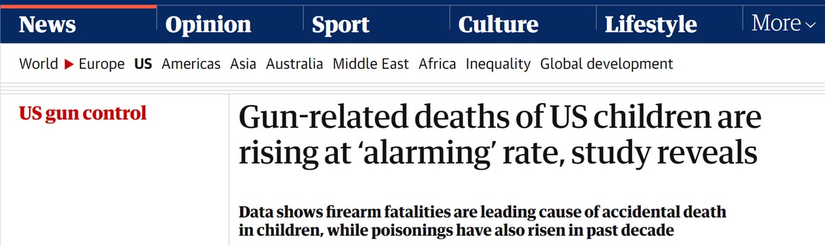 據(jù)英國《衛(wèi)報》網(wǎng)站5日報道,美國波士頓兒童醫(yī)院(Boston Children's Hospital)研究人員進行的一項新的研究發(fā)現(xiàn),在過去十年中,美國與槍支有關(guān)的兒童死亡人數(shù)激增,漲幅高達87%。