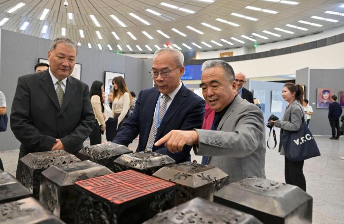 各國(guó)外交官和聯(lián)合國(guó)國(guó)際職員們?cè)谛蕾p中國(guó)藝術(shù)家的作品。歐洲時(shí)報(bào)記者周修怡 攝