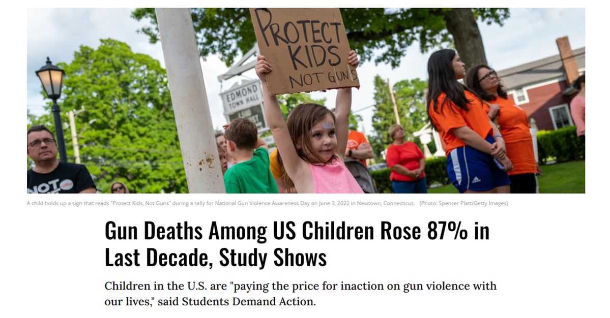 文章援引“槍支暴力檔案”(Gun Violence Archive)的數(shù)據(jù)稱,今年到目前為止,美國已有1300多名兒童和青少年死于槍支,而美國疾病控制與預(yù)防中心(CDC)在4月份發(fā)現(xiàn),在2019年至2021年的短短兩年內(nèi),兒童涉槍死亡人數(shù)上升了50%。