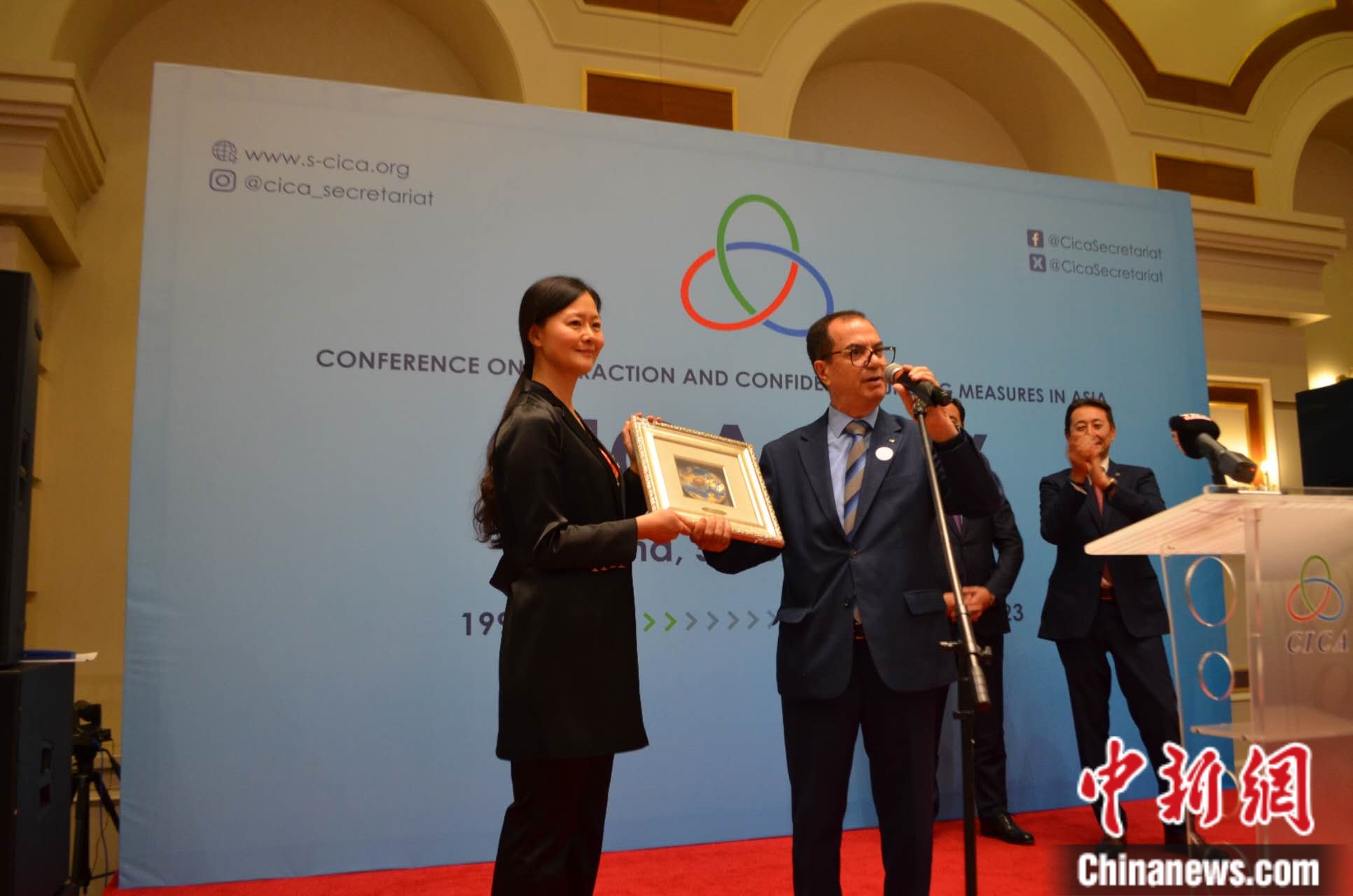 10月5日,哈薩克斯坦阿斯坦納,亞洲相互協(xié)作與信任措施會(huì)議秘書處舉辦成立31周年招待會(huì)。圖為亞信會(huì)議副秘書長(zhǎng)遲方被授予總統(tǒng)頒發(fā)的國(guó)家獎(jiǎng)?wù)?。亞信?huì)議秘書處供圖