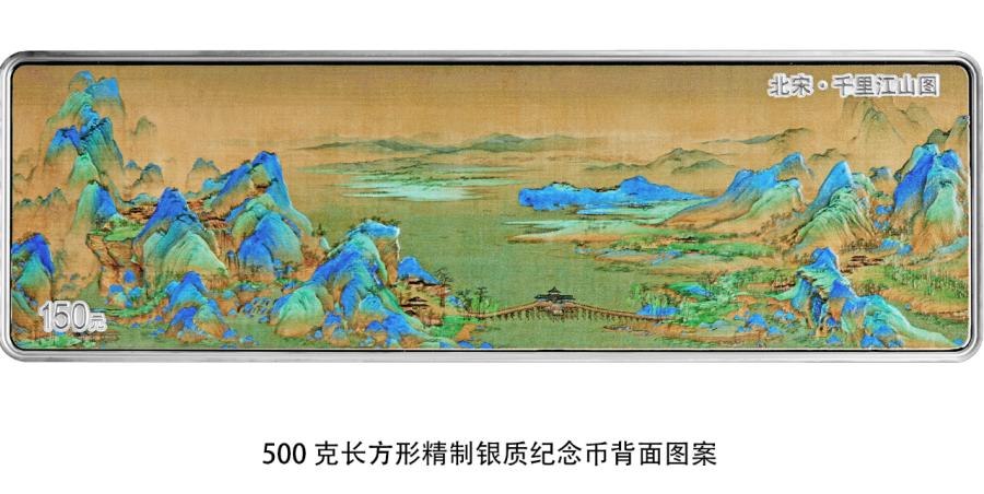 該套金銀紀念幣背面圖案均為《千里江山圖》局部場景,并刊“北宋·千里江山圖”字樣及面額。