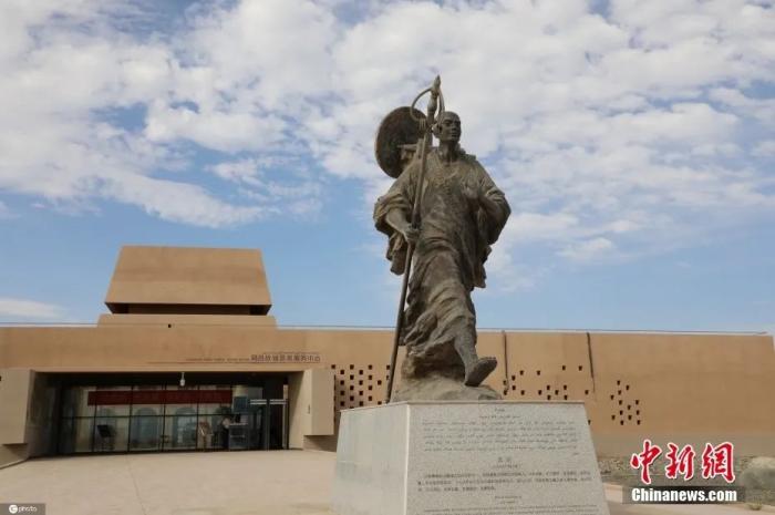資料圖:位于新疆維吾爾自治區(qū)的高昌故城前,現(xiàn)陳列有唐代高僧玄奘的塑像,玄奘西行求法時(shí)曾途經(jīng)此地。