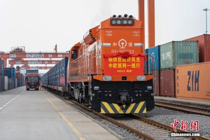 2023年9月17日,河南鄭州,一列滿載醫(yī)療器械、汽車配件等貨物的中歐班列(鄭州)從中國(guó)鐵路鄭州局集團(tuán)有限公司圃田車站駛出,將經(jīng)中國(guó)二連浩特開往德國(guó)漢堡。