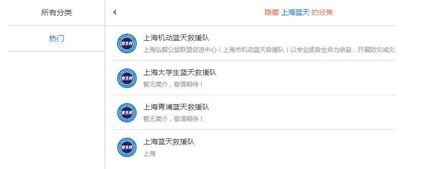“藍天救援·中國”官網(wǎng)品牌授權隊伍查詢中,上海藍天旗下分類有4支隊伍