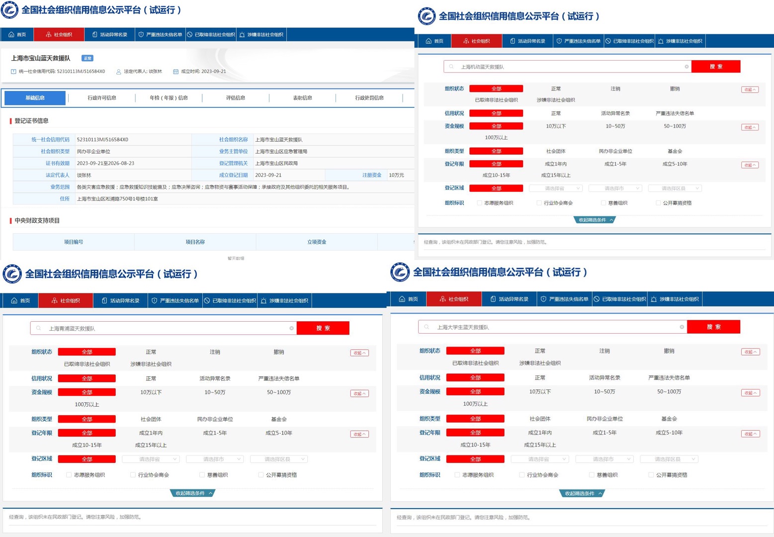 中新網(wǎng)查詢?nèi)珖鐣M織信用信息公示平臺發(fā)現(xiàn),上海市寶山藍天救援隊成立登記日期為2023年9月21日,系民辦非企業(yè)單位,業(yè)務主管單位為上海市寶山區(qū)應急管理局。其余3個組織顯示為“該組織未在民政部門登記,請您注意風險,加強防范”。