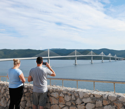 沿著克羅地亞狹長的海岸線一路向南行駛到科馬爾納地區(qū),遠(yuǎn)遠(yuǎn)就能望見如銀鏈般橫臥在山海之間的佩列沙茨大橋。在橋頭一側(cè)的休息區(qū),人們紛紛停下車來,對(duì)著大橋拍照留念。來自克羅地亞北部的卡塞爾和朋友們特地自駕來到這里,開心地請(qǐng)本報(bào)記者幫忙合影?!芭辶猩炒拇髽蜻B通了克羅地亞南北領(lǐng)土,是我們心中最美的大橋!”卡塞爾說。