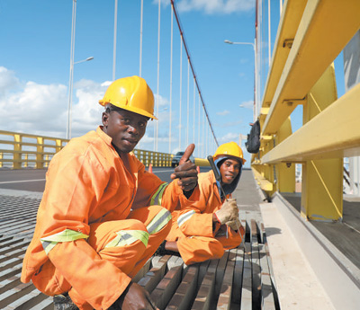 據(jù)介紹,馬普托大橋項(xiàng)目在建設(shè)過程中踐行屬地化經(jīng)營理念,建設(shè)最高峰期雇傭當(dāng)?shù)貑T工超過3000人,焊工、車工、鋼筋工、機(jī)械操作手等一大批專業(yè)技術(shù)人員通過大橋項(xiàng)目提升了職業(yè)技能?!霸诖髽蝽?xiàng)目上學(xué)到的一技之長幫我找到了新的工作?!蹦1瓤饲嗄攴茽柕缕湛ㄕ劶霸隈R普托大橋項(xiàng)目工作的收獲,臉上洋溢著幸福的笑容。