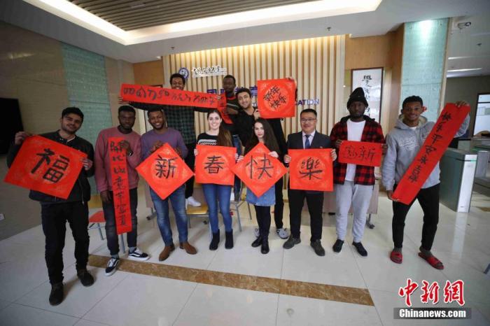 資料圖:2019年2月3日是中國農(nóng)歷臘月二十九,“春節(jié)”將至,來自巴基斯坦、烏茲別克斯坦、烏克蘭等國家和地區(qū)的十余名中國石油大學的留學生在青島歡聚一堂,一起寫“春聯(lián)”、題“?!弊帧①N“窗花”,感受中華文化。中新社記者 胡耀杰 攝