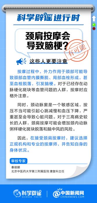 中新網(wǎng)10月12日電 按摩過程中,外力作用于頸部可能導(dǎo)致頸部血管內(nèi)膜撕脫、局部血栓形成,甚至血栓脫落,引發(fā)腦梗。在接受頸肩按摩時(shí),建議選擇正規(guī)機(jī)構(gòu)和專業(yè)的按摩師,并告知自身的身體狀況。(來(lái)源:@科學(xué)辟謠 @中國(guó)新聞網(wǎng) )