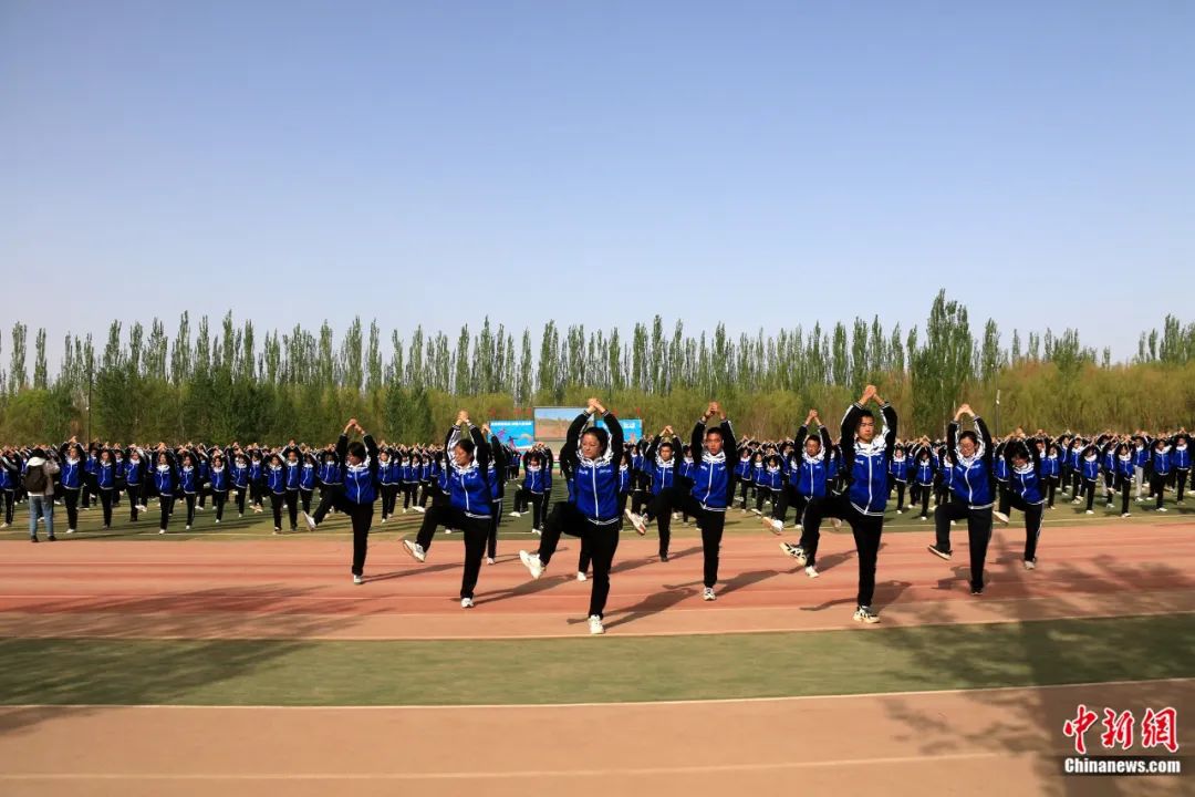 敦煌中學(xué)學(xué)生在操場(chǎng)做敦煌舞課間操。張曉亮 攝