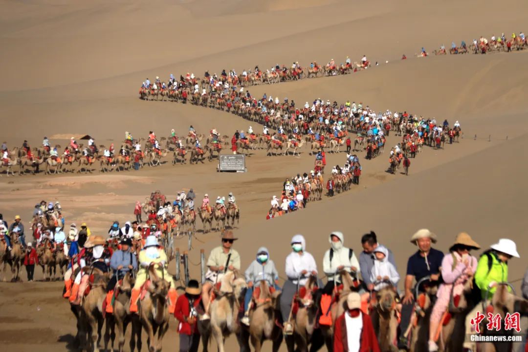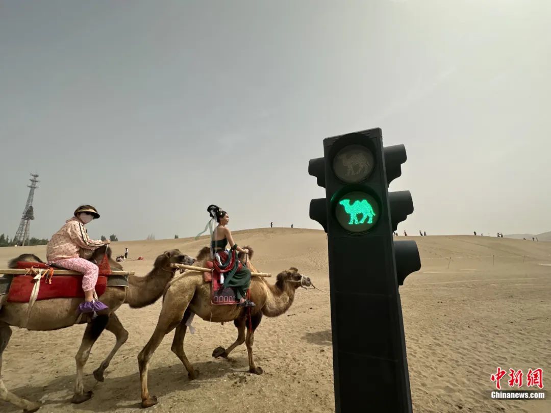 甘肅敦煌鳴沙山下的駱駝紅綠燈。楊艷敏 攝