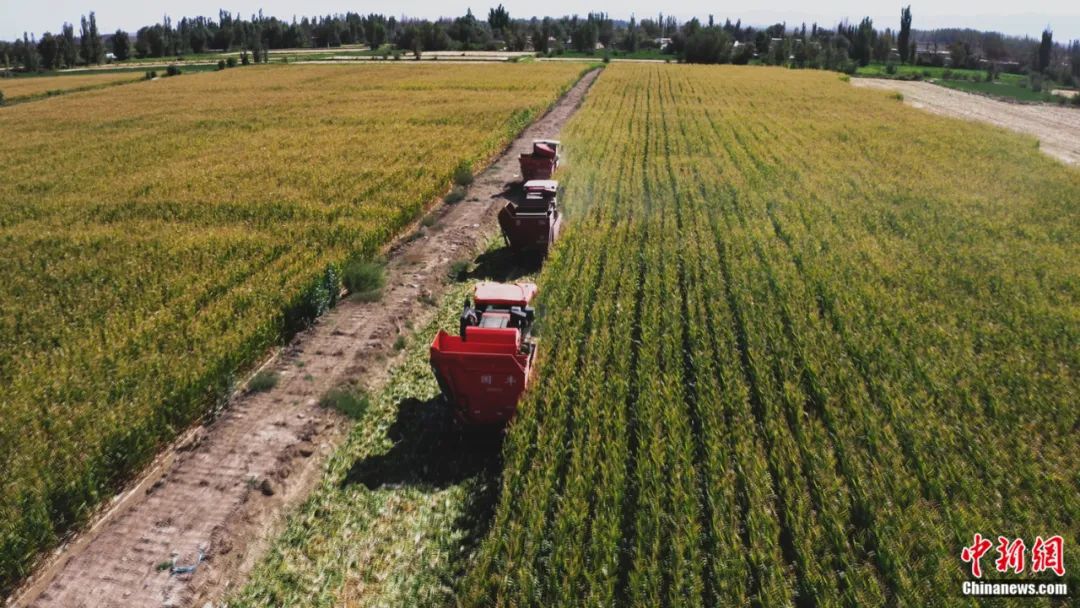 敦煌市莫高鎮(zhèn)新店臺(tái)村的高標(biāo)準(zhǔn)農(nóng)田里,收割機(jī)在田地里收割玉米。郭均強(qiáng) 攝