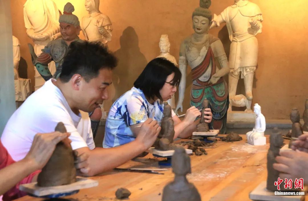 游客在敦煌莫高里工匠村學(xué)習(xí)制作木胎泥塑。張曉亮 攝