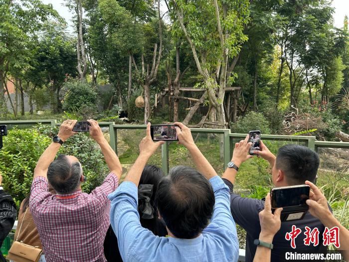 當(dāng)日,第六屆臺胞社團論壇四川分線路考察暨首屆“情融兩岸·品悟天府”臺胞社團領(lǐng)袖四川行活動走進熊貓基地。金秋的熊貓基地陽光燦爛,大熊貓在圈舍中或坐或臥,也有的抱著竹子大快朵頤,追逐嬉戲,十分可愛。