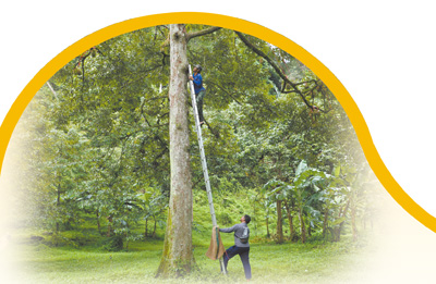 威猜站在十幾米高的榴蓮樹(shù)上,揮刀砍斷榴蓮與樹(shù)杈連接處,幾公斤重的榴蓮落了下來(lái)。樹(shù)底下,他的同伴緊盯著一個(gè)個(gè)從天而降的“刺球”,在它們落地前一瞬間,張開(kāi)麻袋,穩(wěn)穩(wěn)兜住。不一會(huì)兒,地上就碼放了一排榴蓮。