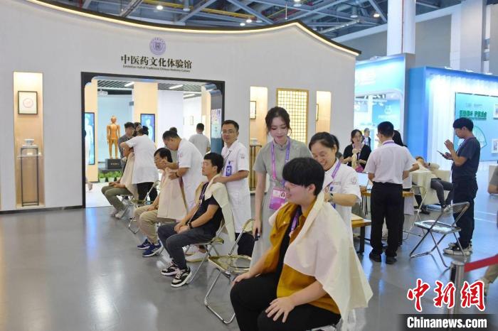 浙江省中山醫(yī)院的推拿團(tuán)隊在中醫(yī)藥文化體驗館服務(wù)中外媒體。浙江省中山醫(yī)院供圖