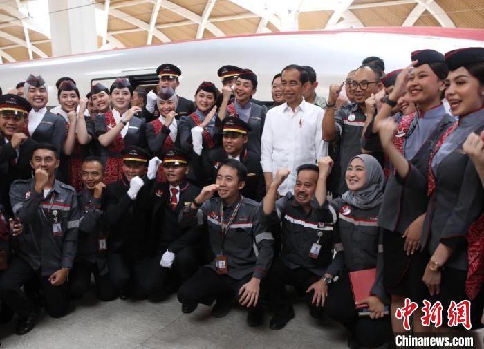 9月13日,印度尼西亞總統(tǒng)佐科考察中印尼合作項(xiàng)目雅萬(wàn)高鐵,并在哈利姆站乘坐G5901次高鐵列車(chē)赴帕達(dá)拉朗站。這是他首次乘坐雅萬(wàn)高鐵。圖為佐科在哈利姆站與乘務(wù)人員合影。 中新社記者 李志全 攝