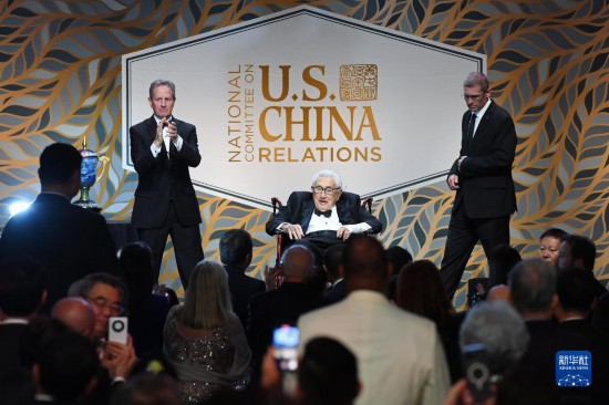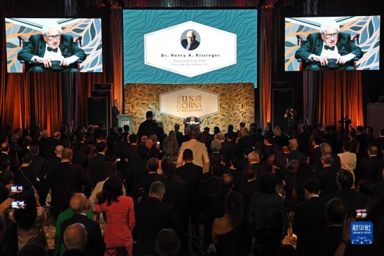 10月24日,美國前國務(wù)卿基辛格(中)出席在紐約舉行的美中關(guān)系全國委員會年度頒獎晚宴。新華社記者李睿攝