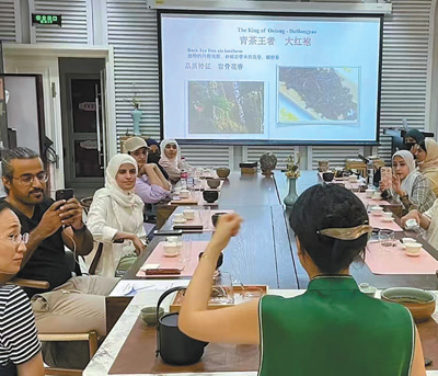 2023年7月,沙特中文學(xué)習(xí)者那丹(左三)在北京語言大學(xué)體驗中國茶文化。