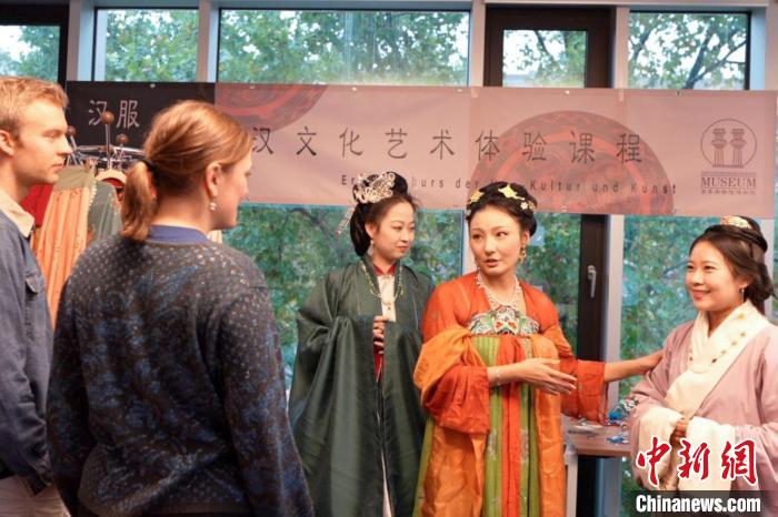圖為活動(dòng)講師為德國學(xué)生介紹漢制漢服特點(diǎn)。漢文化藝術(shù)交流中心供圖。
