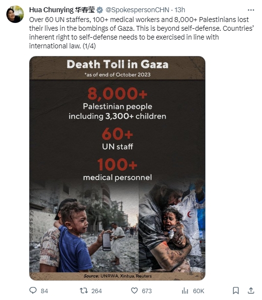 據(jù)報道,當(dāng)天,華春瑩發(fā)帖提及加沙地帶的人員傷亡。她稱,“超過60名聯(lián)合國工作人員、100名醫(yī)務(wù)工作者、8000名巴勒斯坦人在對加沙的轟炸中喪生。這超出了自衛(wèi)的范圍。各國擁有的自衛(wèi)權(quán)須依據(jù)國際法行使?!?/p>