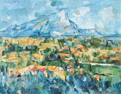 由此,塞尚、梵高、高更等藝術(shù)家的繪畫(huà)語(yǔ)言逐漸展現(xiàn)出不同于印象派的風(fēng)格。塞尚在繪畫(huà)中拋棄了明暗和透視,尋求色彩與形狀的互相牽制,使畫(huà)面結(jié)構(gòu)更加穩(wěn)定嚴(yán)謹(jǐn),制造出物與物之間的空間張力。他的油畫(huà)作品《圣維克多山》(見(jiàn)圖,曲音供圖)用冷暖色搭配勾勒出許多幾何形狀的色塊,形如房屋、狀似樹(shù)木,以相互交疊的視覺(jué)呈現(xiàn)替代了透視效果,暗示出遠(yuǎn)近和前后關(guān)系,令畫(huà)面中的山峰無(wú)論從哪個(gè)角度觀看都顯得雄偉壯麗。