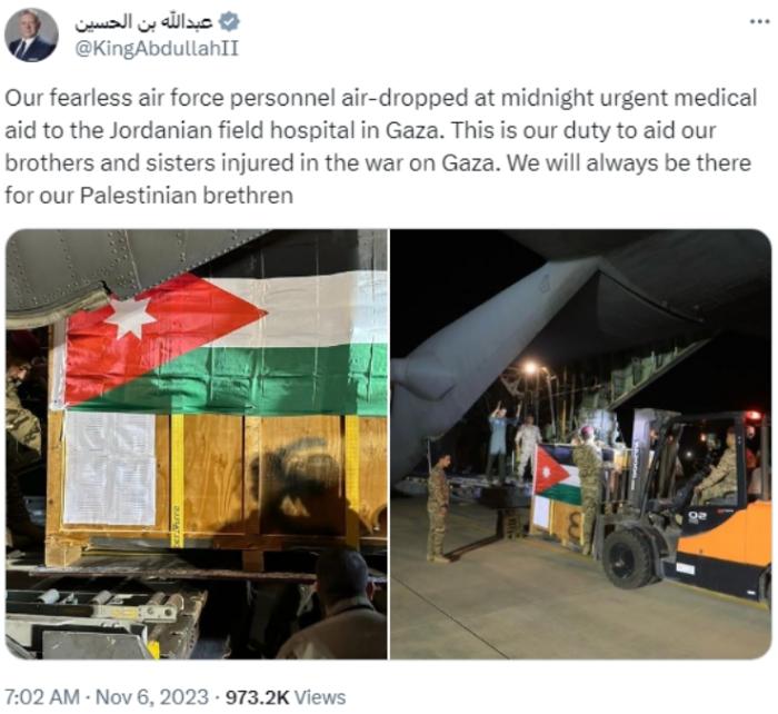 中新網11月6日電 當?shù)貢r間6日,約旦國王阿卜杜拉二世在社交媒體發(fā)文稱,約旦空軍在6日午夜時分向加沙的約旦野戰(zhàn)醫(yī)院空投了緊急醫(yī)療援助物資。
