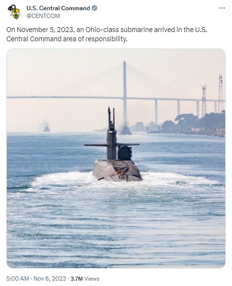 據(jù)報(bào)道,當(dāng)天,美國(guó)中央司令部在社交媒體上發(fā)帖稱,“11月5日,一艘‘俄亥俄’級(jí)戰(zhàn)略潛艇抵達(dá)中東地區(qū)。”