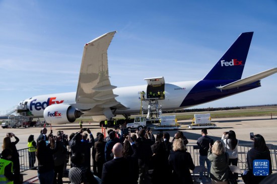 11月8日,運送大熊貓的專機(jī)從美國弗吉尼亞州的華盛頓杜勒斯國際機(jī)場起飛。新華社記者劉杰攝