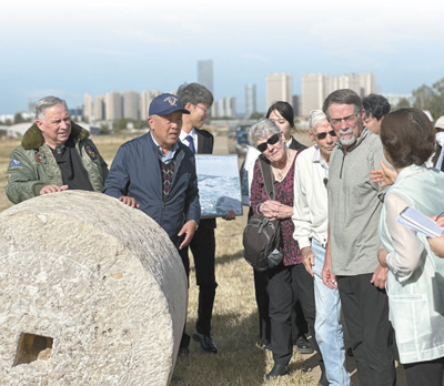 在云南昆明呈貢機(jī)場舊址,代表團(tuán)一行聆聽講解員講述石碾背后的故事。呈貢機(jī)場曾是飛虎隊(duì)在昆明的主要基地之一,機(jī)場建設(shè)期間,當(dāng)?shù)厝嗣窭瓌泳薮笫肫秸艿溃冻銎D苦努力。