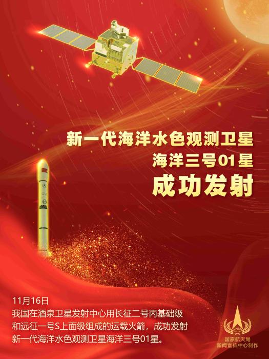 中新網(wǎng)酒泉11月16日電 (馬帥莎 張未)11月16日11時55分,中國在酒泉衛(wèi)星發(fā)射中心用長征二號丙基礎級和遠征一號S上面級組成的運載火箭,成功發(fā)射新一代海洋水色觀測衛(wèi)星海洋三號01星。該衛(wèi)星指標達到國際水色遙感衛(wèi)星先進水平,可滿足中國海洋環(huán)境監(jiān)測的主體業(yè)務需求,并能夠服務于生態(tài)文明建設、智慧海洋工程建設、“一帶一路”倡議等國家重大戰(zhàn)略需求。