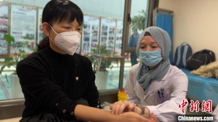 11月中旬,李峰的妻子瑪麗亞(右),作為甘肅中醫(yī)藥大學附屬醫(yī)院俄羅斯實習生,為甘肅患者把脈。王牧雨 攝