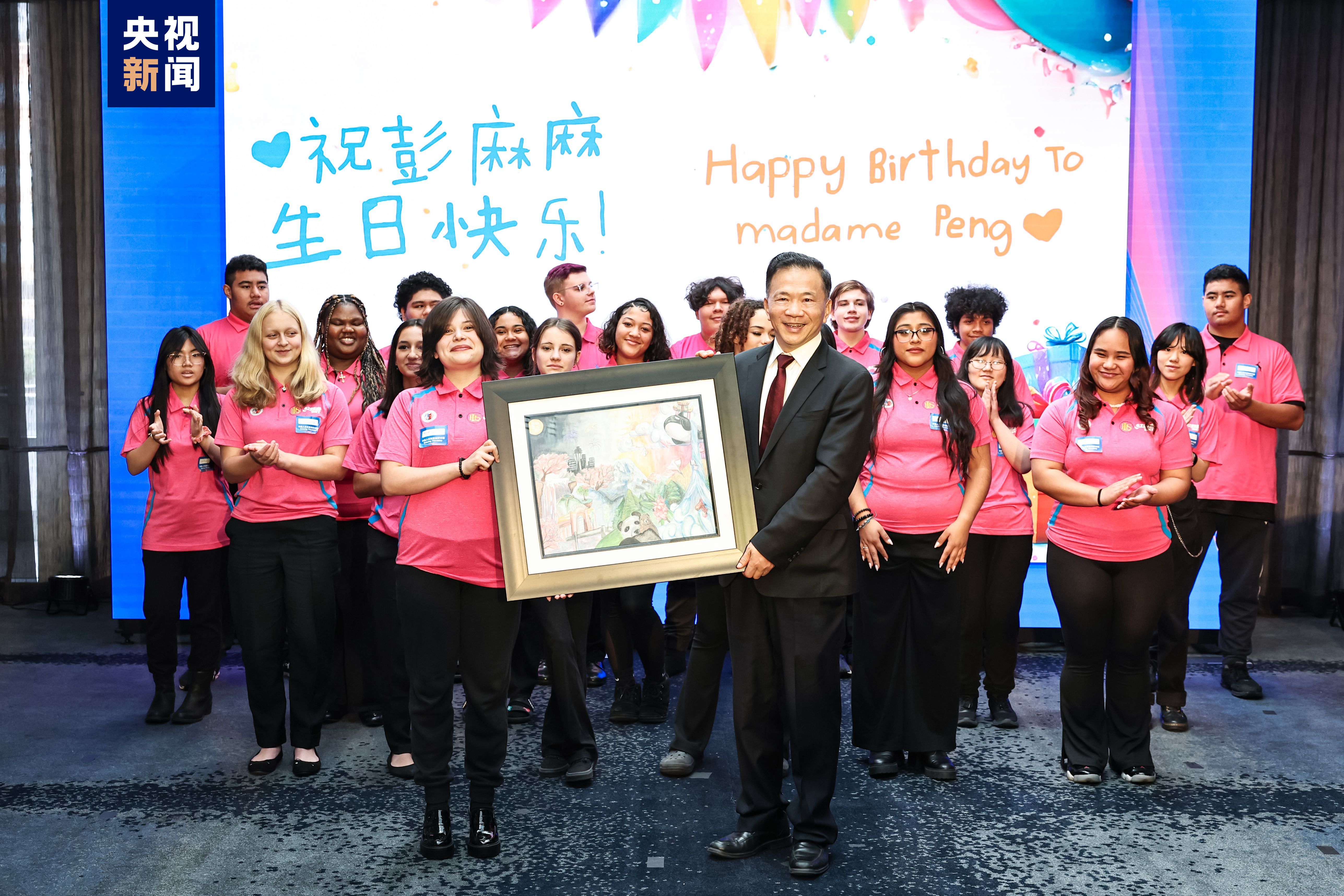 活動現(xiàn)場,來自華盛頓州林肯中學的合唱團演唱了中文歌曲《在希望的田野上》和英文歌曲《伴我同行》,祝愿中美友誼的紐帶更加牢固,煥發(fā)新的活力。同學們還為習近平主席和夫人彭麗媛精心準備了手繪畫作《一起向未來》,并用精美的生日賀卡和《生日快樂》歌親切地為“彭麻麻”送上了生日祝福??偱_臺長代為接收。