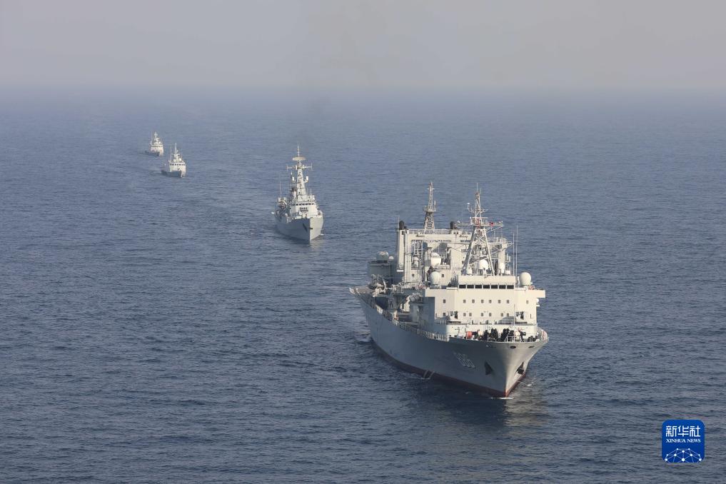 中巴“海洋衛(wèi)士-3”海上聯(lián)合演習(xí)在阿拉伯海北部??沼蚺e行,雙方艦艇組織編隊(duì)運(yùn)動(dòng)(11月14日攝)。新華社發(fā)(姜霞攝)