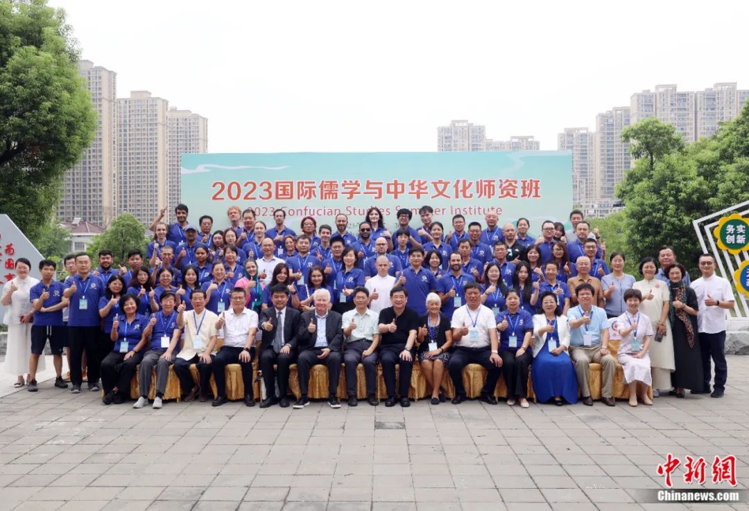 2023年8月14日,與會(huì)嘉賓和學(xué)院在活動(dòng)現(xiàn)場(chǎng)合影。當(dāng)日,由北京外國(guó)語(yǔ)大學(xué)與國(guó)際儒學(xué)聯(lián)合會(huì)聯(lián)合主辦的“2023國(guó)際儒學(xué)與中華文化師資班”開(kāi)班儀式在江蘇省丹陽(yáng)市舉行,來(lái)自20多個(gè)國(guó)家和地區(qū)的120名學(xué)員,參加為期13天的中華傳統(tǒng)文化研修。李國(guó)慶 攝
