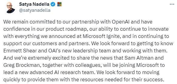 據(jù)路透社20日報道,微軟CEO納德拉在社交媒體上發(fā)文稱,微軟仍然致力于與OpenAI的合作,并期待了解希爾領(lǐng)導(dǎo)的新團(tuán)隊。同時納德拉宣布,阿爾特曼、OpenAI前總裁格雷格·布羅克曼及其同事將加入微軟,領(lǐng)導(dǎo)一個新的高級人工智能研究團(tuán)隊。微軟期待著迅速采取行動,為其成功提供所需的資源。