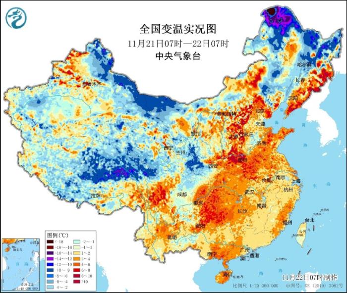 寒潮黃色預警:22日08時至24日08時,陜西中北部、寧夏北部、內蒙古、東北地區(qū)、華北、黃淮、江淮、江南東北部等地氣溫將先后下降6~10℃,其中,內蒙古中東部、東北地區(qū)中東部、河北北部、山西北部、山東大部等地降溫12~14℃,上述部分地區(qū)降溫可達16~20℃。24日早晨,最低氣溫0℃線將位于蘇皖中部至河南中南部、陜西南部、甘肅東南部等地,內蒙古東部和黑龍江大部最低氣溫將降至-20℃以下,局地可達-30℃以下。